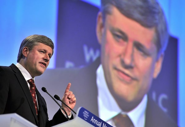 Prime Minister Stephen Harper addresses the World Economic Forum in Davos, Switzerland, on January 28, 2010.FABRICE COFFRINI