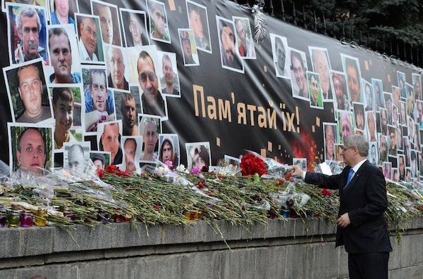 Prime Minister Stephen Harper lays a bouquet of flowers at a makeshift memorial on Hrushevsky Street in Kiev on March 22, 2014.SEAN KILPATRICK/The Canadian Press