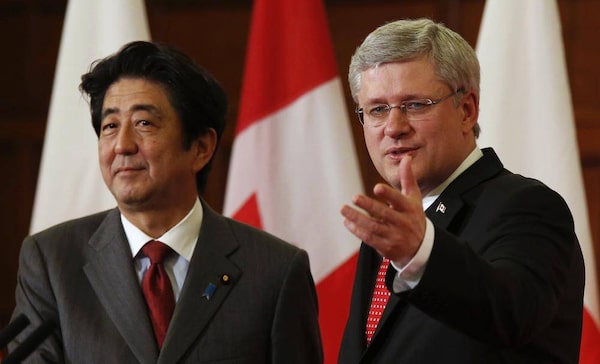 Prime Minister Stephen Harper, right, gestures at the conclusion of a news conference with his Japanese counterpart Shinzo Abe on Parliament Hill in Ottawa on Sept. 24, 2013. Mr. Harper says he will encourage diplomatic efforts to settle the Iranian nuclear question, but he warns that Iran must be judged by deeds, not words.CHRIS WATTIE/Reuters