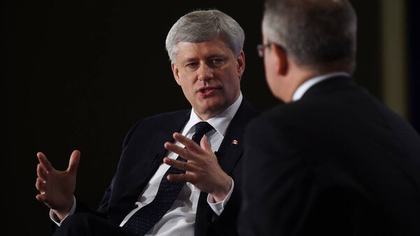 Conservative leader Stephen Harper takes part in a question and answer session with Dan Kelly of the Canadian Federation of Independent Business (CFIB) as he makes a campaign stop in London, Ontario, on Wednesday, August 19, 2015.Sean Kilpatrick