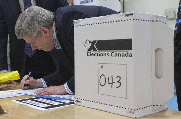 Conservative leader Stephen Harper signs his name before voting in the Canadian federal election in his Calgary riding on May 2, 2011.© POOL New / Reuters/Reuters