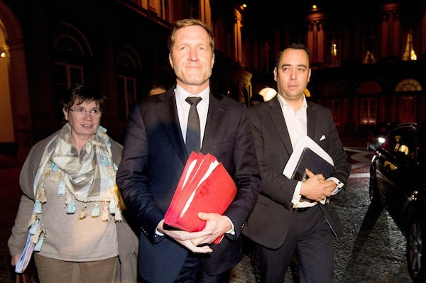 Alda Greoli, left, Culture Minister for Federation Wallonia-Brussels, Walloon First Minister Paul Magnette and Walloon Public Works Minister Maxime Prevot leave after a meeting on the EU-Canada Comprehensive Economic and Trade Agreement in Brussels Tuesday.JASPER JACOBS/AFP / Getty Images