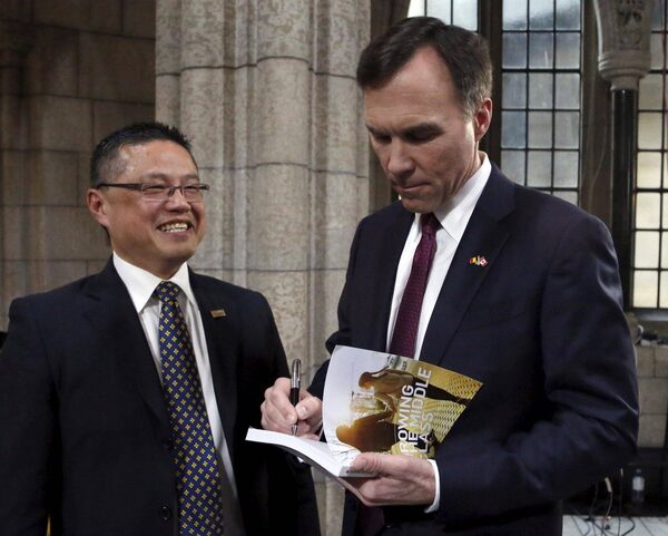 Canada's Finance Minister Bill Morneau signs a copy of the budget for Raymond Louie, president of the Federation of Canadian Municipalities, after delivering the budget on Parliament Hill in Ottawa March 22, 2016. REUTERS/Patrick DoylePATRICK DOYLE/Reuters