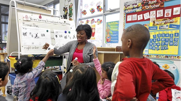 Mekhi Rutherford (right) participates in a class exercise with his teacher Darcie Sutherland during his Senior Kindergarten class at Ellen Fairclough Public Shchool in Markham.Anne-Marie Jackson for The Globe and Mail
