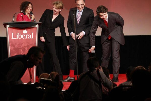 Martha Hall Findlay and Justin Trudeau lift Martin Cauchon's pant legs to show his Liberal Red socks.Peter Power/The Globe and Mail