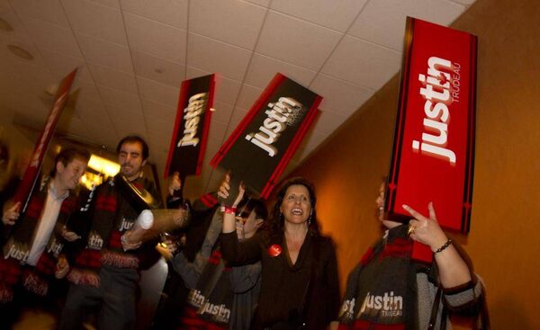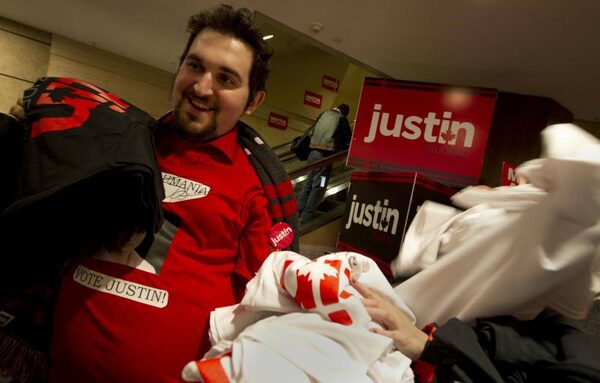 The Liberal Party held an event in Ottawa, Ontario on April 14, 2013 to announce the result of the leadership vote that has been going on for the past week. While there are still many signs for each of the six candidates for leadership, the majority of items being waved and given away are for Justin Trudeau.Peter Power/The Globe and Mail