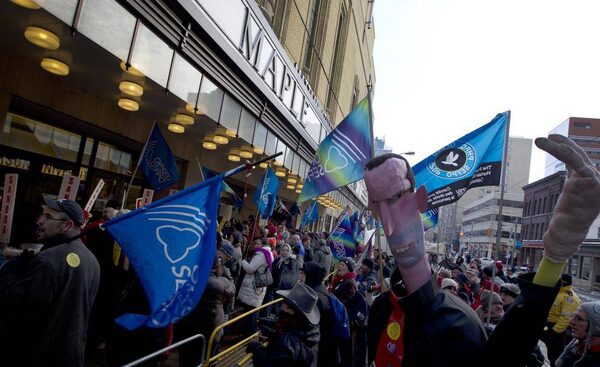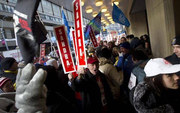 Public sector union members protest the Ontario Liberal government's legislation imposing contracts on teachers outside the convention.Peter Power/The Globe and Mail