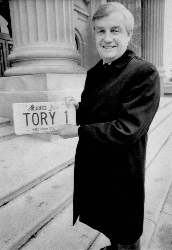 Mr. Lougheed, having recently finished his final cabinet meeting in October, 1985, holds up the provincial vanity licence plate his cabinet ministers gave him.MIKE PINDER/The Canadian Press