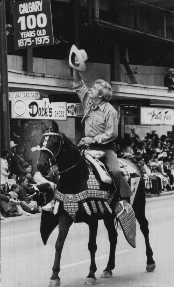 Mr. Lougheed serves at the grand marshall leading off the parade at the 1975 Calgary Stampede, held in the city’s centennial year.The Canadian Press