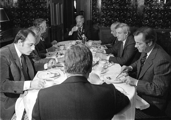 Mr. Lougheed, second from right, joins seven other premiers – the so-called Gang of Eight – who disagree with prime minister Pierre Trudeau’s constitutional package at breakfast in Ottawa on Nov. 3, 1981.PETER BREGG/The Canadian Press