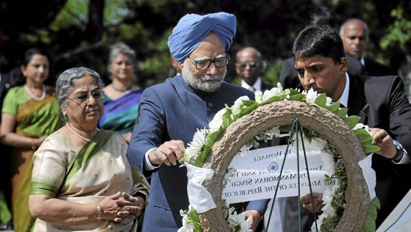 Indian Prime Minister Manmohan Singh, accompanied by his wife, Gursharan Kaur, left, lays a wreath at the Air India memorial in Toronto on June 28.Fred Lum/The Globe and Mail