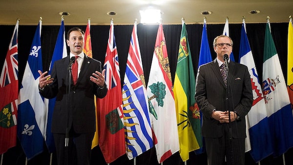 P.E.I. Premier Robert Ghiz, left and Saskatchewan Premier Brad Wall speak at a press conference to discuss health care innovation in Canada in Toronto on Friday, June 1, 2012.Aaron Vincent Elkaim/The Canadian Press