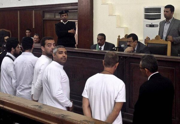Al-Jazeera English bureau chief Mohamed Fahmy, center, producer Baher Mohamed, center left, and correspondent Peter Greste, second right, stand in a courtroom along with several other defendants during their trial on terror charges, in Cairo, Egypt, Monday, March 31, 2014.Sarah El Deeb/The Associated Press