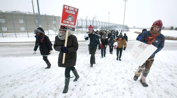 Protesters march outside the Lindsay Central East Correctional Centre on Dec. 14, 2013. Immigration detainees at the Centre East Correctional Centre, some of whom who have been indefinitely held for as long as seven years, are calling for their release and an end to indefinite detention and maximum security incarceration by staging a 72-hour fast.FRED THORNHIILL/The Globe and Mail