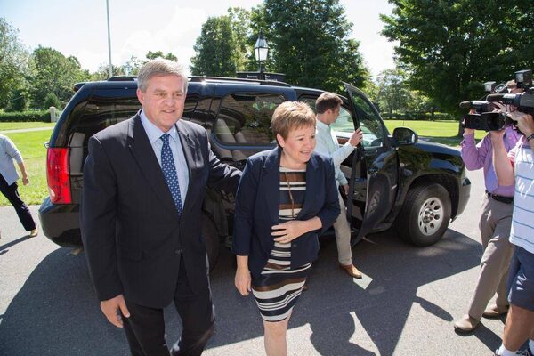 New Brunswick Premier David Alward and his wife Ronda arrive ahead of Alward's meeting with Lt.-Gov. Graydon Nicholas in Fredericton, N.B., on Monday, August 18, 2014. Premier Alward met with Lt. Gov. Nicholas to ask for the legislative assembly to be dissolved ahead of next month's provincial election.Keith Minchin/The Canadian Press
