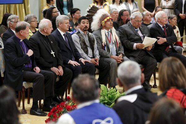 Anglican Primate Fred Hiltz (L), Catholic Archbishop Gerard Pettipas, Prime Minister Stephen Harper, Inuit National President Terry Audla, Assembly of First Nations National Chief Perry Bellegarde, Justice Murray Sinclair, and Governor General David Johnston attend the Truth and Reconciliation Commission of Canada's closing ceremony at Rideau Hall in Ottawa June 3, 2015.Blair Gable/Reuters