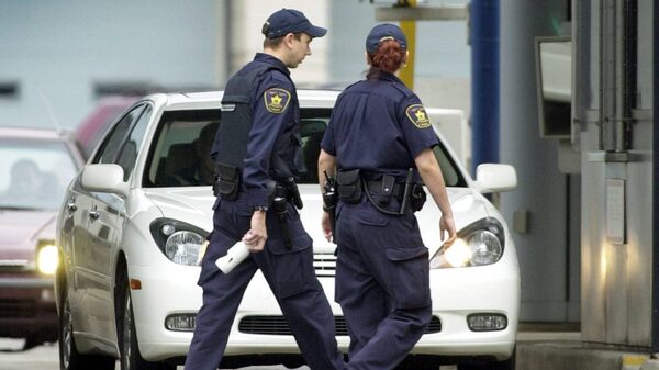 Canada Customs officers walk past a car attempting to enter Canada at the Windsor-Detroit Tunnel.