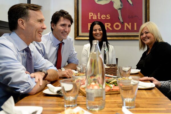 Finance Minister Bill Morneau, Prime Minister Justin Trudeau and Small Business and Tourism Minister Bardish Chagger chat over lunch with the owners of family-run restaurant, Pastaggio Italian Eatery, in Whitchurch-Stouffville, Ont., on Monday, October 16, 2017.Nathan Denette/The Canadian Press