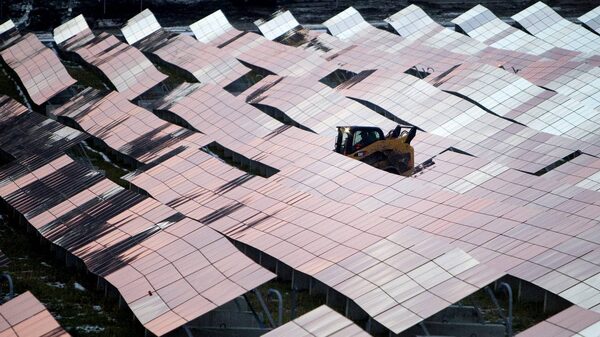 At the end of the work day a worker on construction equipment carefully navigates his way through hudreds of solar panels at the Lily Lake Solar facility near Peterborough, Ont. November 29, 2010.Fred Thornhill for The Globe and Mail
