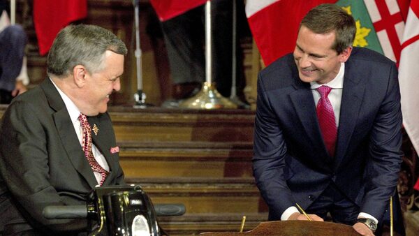 Ontario Premier Dalton McGuinty shares a laugh with Lieutenant-Governor David Onley as he swears in his cabinet at Queen's Park in Toronto on Oct. 20, 2011.Frank Gunn/The Canadian Press