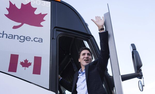 Liberal Leader Justin Trudeau waves as he boards his campaign bus following a campaign event at a trade school Thursday, Oct. 8, 2015 in Vaughan, Ont.Paul Chiasson/The Canadian Press