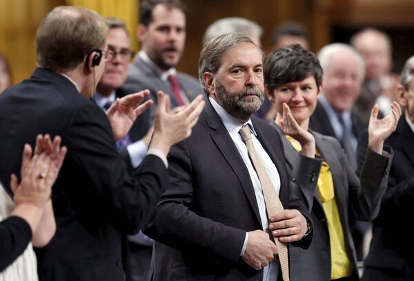 New Democratic Party leader Thomas Mulcair receives a standing ovation from his caucus during Question Period in the House of Commons on Parliament Hill in Ottawa April 22, 2015.CHRIS WATTIE/Reuters