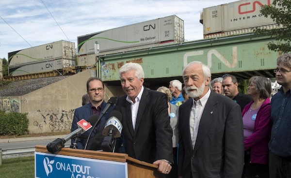 A train passes by as Bloc Québécois leader Gilles Duceppe announces his party's rail transportation policy during a news conference Sept. 10, 2015 in Beloeil, Que.Paul Chiasson/The Canadian Press