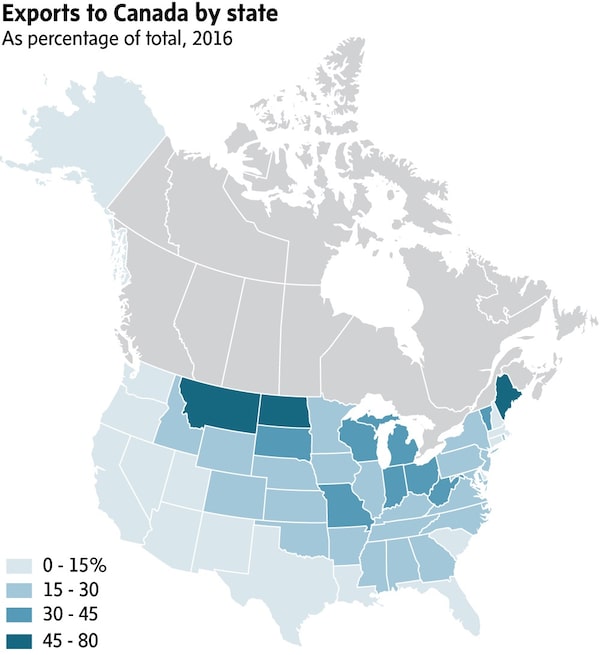 This map, using data retrieved from the U.S. Census Bureau, shows Canada’s share of total U.S. exports, by state. It shows that, for a majority of states, less than 30 per cent of total exports go to Canada.MURAT YÜKSELIR/THE GLOBE AND MAIL (SOURCE: U.S. CENSUS BUREAU)