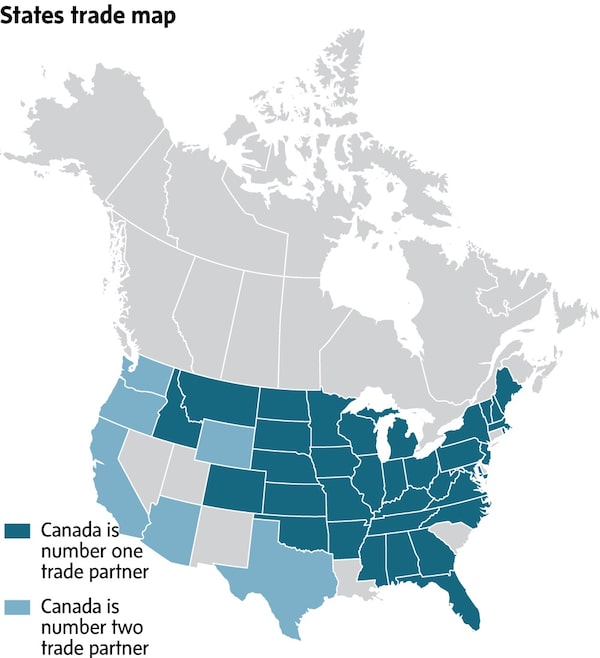 For years, the Canadian government has repeated its claim that Canada is the most important foreign market for 35 U.S. states. This map is posted on a government website that promotes trade.MURAT YÜKSELIR/THE GLOBE AND MAIL (SOURCE: STATSCAN)