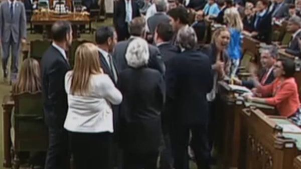 Video from the House of Commons shows New Democrat MPs gathered in the aisle as Conservative whip Gordon Brown stood waiting behind them. Mr. Brown needed to be in his place for the vote to begin. Mr. Trudeau strode quickly across the aisle and pulled Mr. Brown forward past the NDP group, which included leader Tom Mulcair, at the same time elbowing NDP MP Ruth Ellen Brosseau behind him. Mr. Trudeau and Mr. Mulcair then began shouting at each other as MPs gathered around.