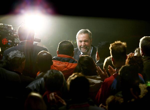 Canada's New Democratic Party (NDP) leader Tom Mulcair greets supporters as he arrives to give his concession speech after Canada's federal election in Montreal, Quebec, October 19, 2015.MATHIEU BELANGER/Reuters