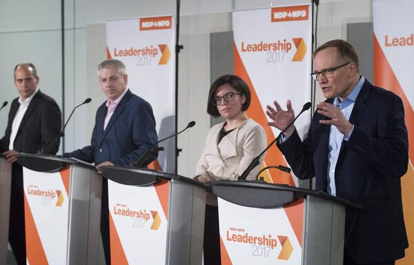 NDP leadership candidates Guy Caron, left, Charlie Angus, Niki Ashton and Peter Julian participate in a debate in Montreal on March 26, 2017.Graham Hughes/The Canadian Press