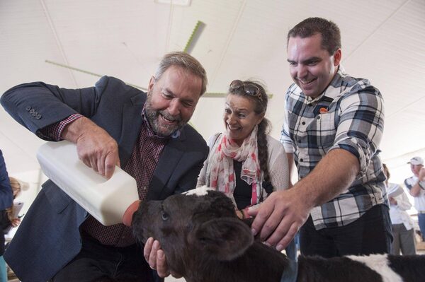 NDP Leader Tom Mulcair, left to right, his wife Catherine Pinhas Mulcair, and Federal NDP Candidate of Perth-Wellington Ethan Rabidoux feed a two-day old calf at the Slits Dairy Farm in Brunner, Ont., on Wednesday, July 22, 2015.Hannah Yoon/The Canadian Press
