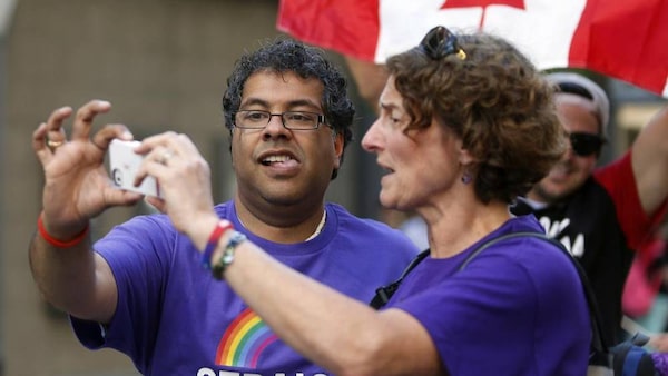 Calgary Mayor Naheed Nenshi and another marcher take a photo while marching in a gay pride parade in Calgary, Alta., Sunday, Sept. 1, 2013.Jeff McIntosh/The Canadian Press