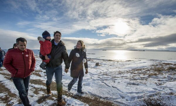 Hunter Tootoo walks with Justin Trudeau and his family along the shores of Frobisher Bay, October 10, 2015, in Iqaluit.Paul Chiasson/The Canadian Press