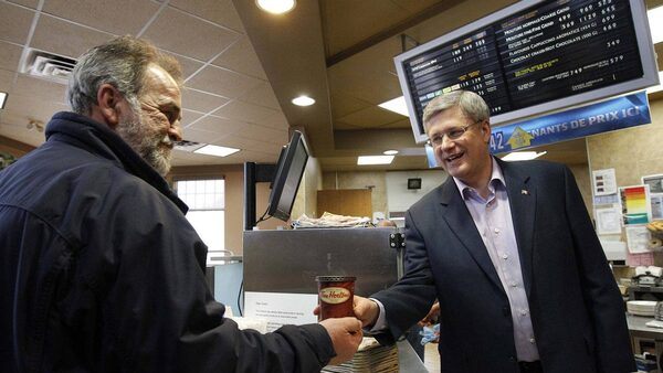 Conservative leader and Canada's Prime Minister Stephen Harper works behind the counter during a campaign stop at a Tim Hortons in Dieppe, New Brunswick April 1, 2011. Canadians will head to the polls in a federal election May 2.Chris Wattie/Reuters