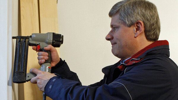 Prime Minister Stephen Harper uses a nail gun while touring a home undergoing renovations in Ottawa on Jan. 28, 2009.CHRIS WATTIE/Reuters