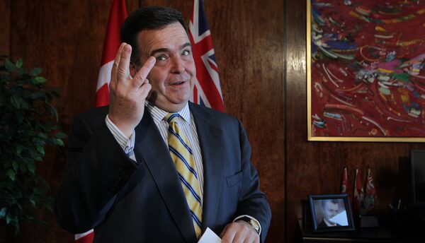 Ontario Finance Minister, The Honourable Dwight Duncan chats with the media while posing for a photo during a pre-budget press conference in his office in Toronto on March 26, 2012, saying the Liberal government has had three balanced budgets.Deborah Baic/The Globe and Mail