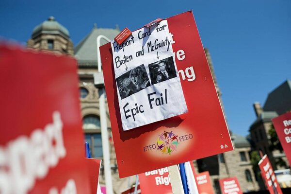 A sign criticizing Ontario’s McGuinty government is held by a protester at a rally for public education and democracy organized by the Elementary Teachers' Federation of Ontarioat Queens Park in Toronto on Aug. 28, 2012.Aaron Vincent Elkaim/The Canadian Press