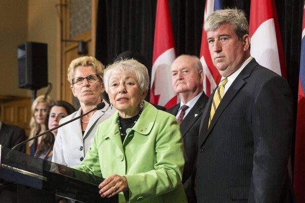 Dr. Anne Golden, centre, chair of the Transit Investment Strategy Advisory Panel, stands alongside Ontarios Premier Kathleen Wynne and Transportation Minister Glenn Murray in September. Ontario’s transit-funding panel is eyeing a gas-tax raise, sources say.Chris Young/The Globe and Mail