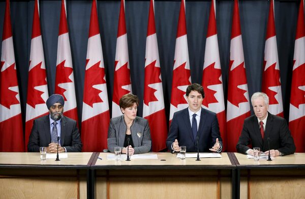 Prime Minister Justin Trudeau speaks during a news conference with Defence Minister Harjit Sajjan (L), International Development Minister Marie-Claude Bibeau (2nd L) and Foreign Minister Stephane Dion in Ottawa, Feb. 8, 2016.CHRIS WATTIE/Reuters