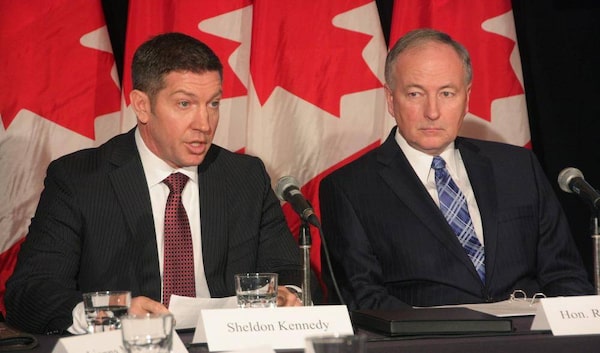 Former NHLer Sheldon Kennedy, left, speaks at a news conference with Justice Minister Rob Nicholson in Toronto on Monday, Feb. 4, 2013.COLIN PERKEL/The Canadian Press