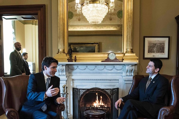 Canada's Prime Minister Justin Trudeau (L) and Speaker of the House Paul Ryan (R-WI) talk before a meeting on Capitol Hill February 13, 2017 in Washington, DC.BRENDAN SMIALOWSKI/AFP / Getty Images