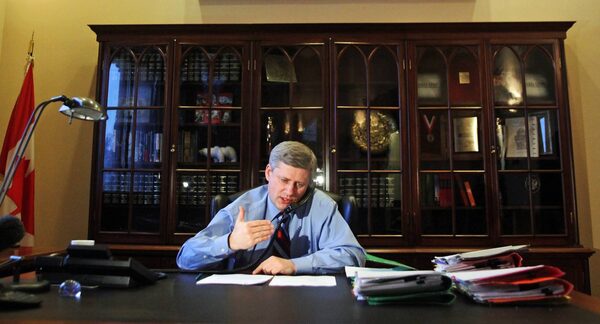 Prime Minister Stephen Harper gives a radio interview in his Langevin Block office on Monday, January 18, 2010.FRED CHARTRAND