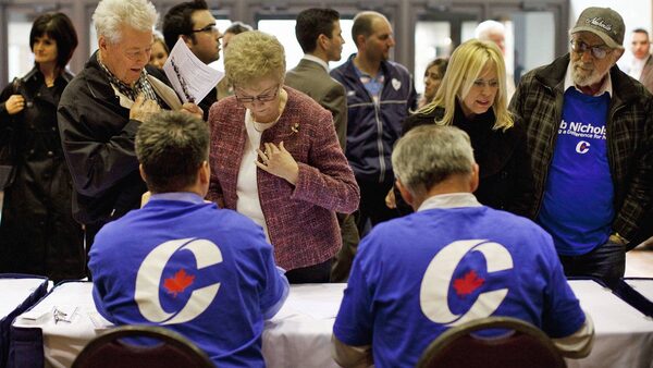 Supports line to get their pre-approved passes to a Conservative election rally in Hamilton on April 7, 2011.Moe Doiron/The Globe and Mail