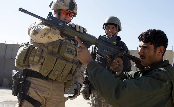 In this Jan. 17, 2010 file photo, Canadian Police Constable Craig Dickie, left, from Milton, Ontario, part of the Canadian Police Contingent, demonstrates a gun to an Afghan Police officer at a checkpoint in Kandahar City.Kirsty Wigglesworth