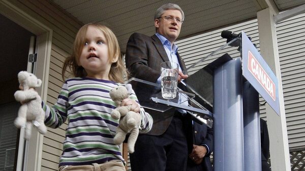 Prime Minister Stephen Harper speaks as 2.5-year-old Fiona Wellburn plays with her toys during a campaign stop in Saanich, B.C., on March 28, 2011.The Canadian Press