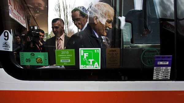 NDP Leader Jack Layton boards the bus after a campaign stop at Surrey, B.C., on March 27.Andrew Vaughan/The Canadian Press