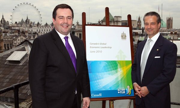 (Photo: Immigration Minister Jason Kenney and Michael Collins of the U.K. Chamber of Commerce on the roof of Canada House in London on Monday, June 21)
