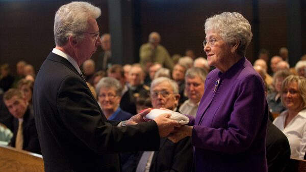 Dorothy Babcock accepts a Canadian flag from Jean-Pierre Blackburn, Minister of Veterans Affairs on Feb. 27, 2010, in Spokane, Wash. This was the flag that flew over the Peace Tower on Parliament Hill the day Jack Babcock, Canada's last known First World War veteran passed away.Veterans Affairs Canada
